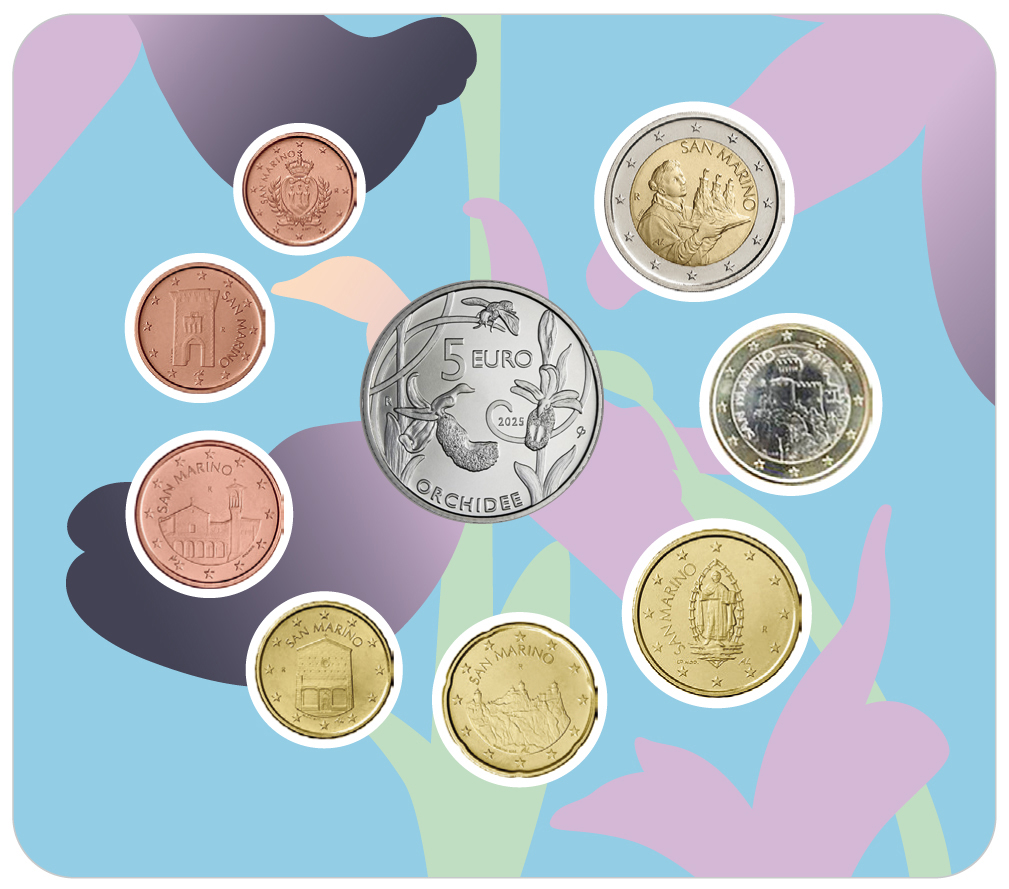 La serie “nove tagli” realizzata in soli 8.000 esemplari, comprende invece le stesse otto monete divisionali, accompagnate dalla moneta da 5 euro in argento “Orchidee spontanee”, fior di conio, millesimo 2025.