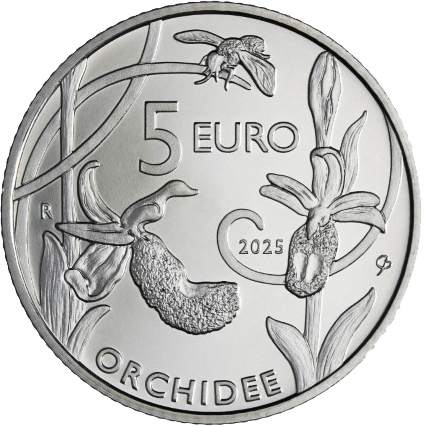 - Rovescio: al centro la rappresentazione di due orchidee Ophrys bertolonii e in alto un’ape Megachile parietina posata su un filo d’erba. Completano la moneta a sinistra la lettera R, identificativo della Zecca di Roma, al centro il valore 5 EURO e l’anno 2025, a destra le iniziali dell’autrice del bozzetto Chiara Principe, CP, e in basso al centro la scritta ORCHIDEE.